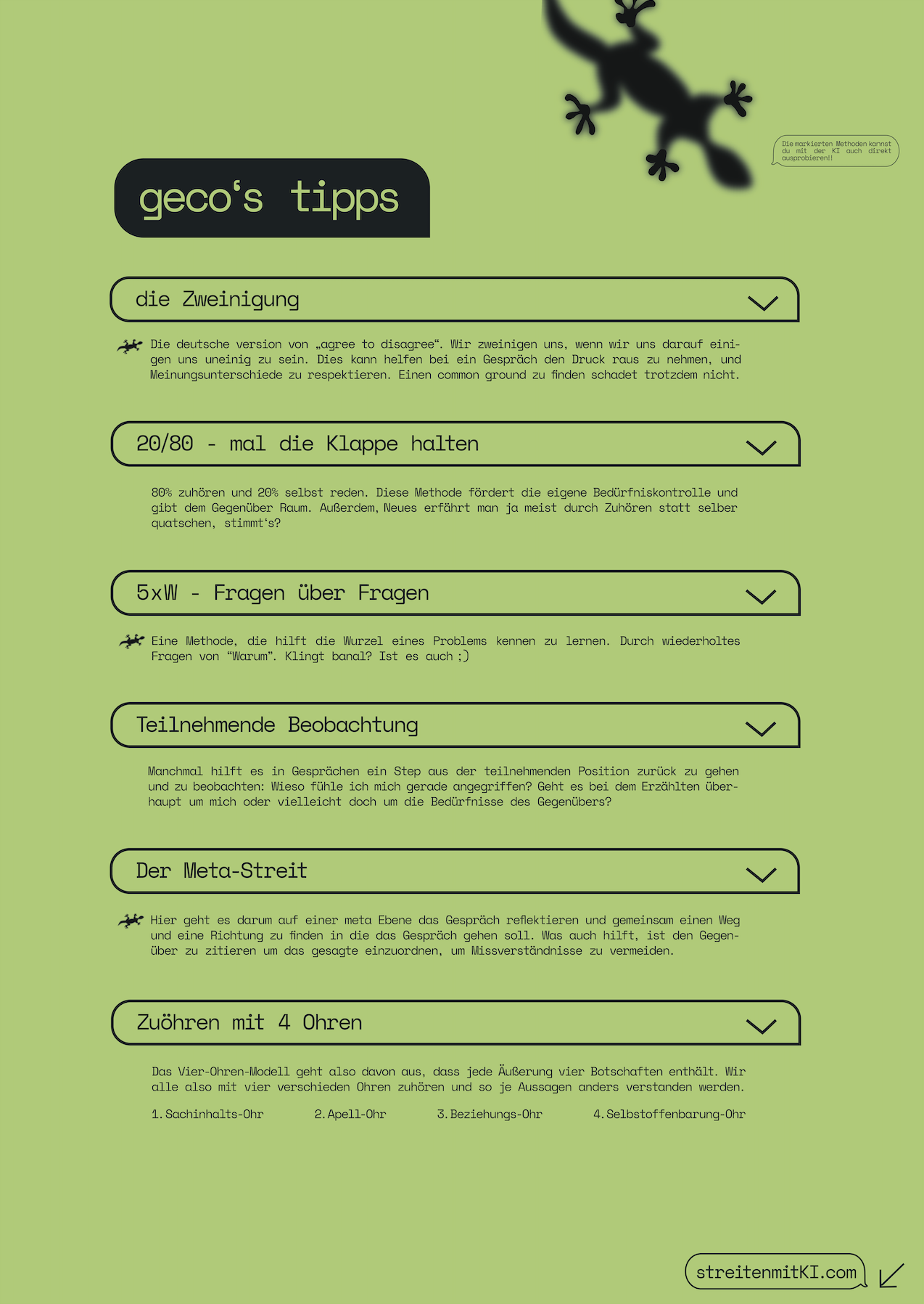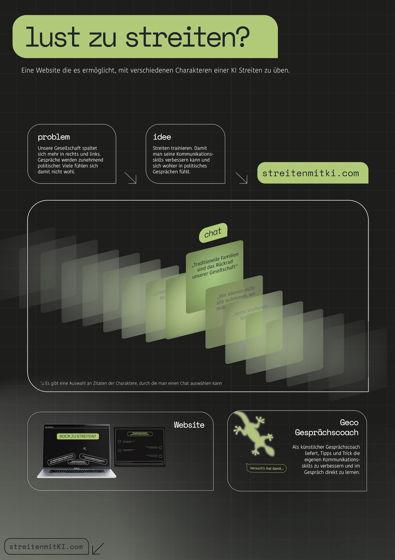 Mithilfe unserer Streit KI kann das streiten trainiert werden. Hier gibt es eine Auswahl an Charakteren, die verschiedene politische Meinungen und Werte vertreten. Während des Chats liefert „Geco“, der Gesprächscoach, Tipps und Methodiken zur Gesprächsführung.